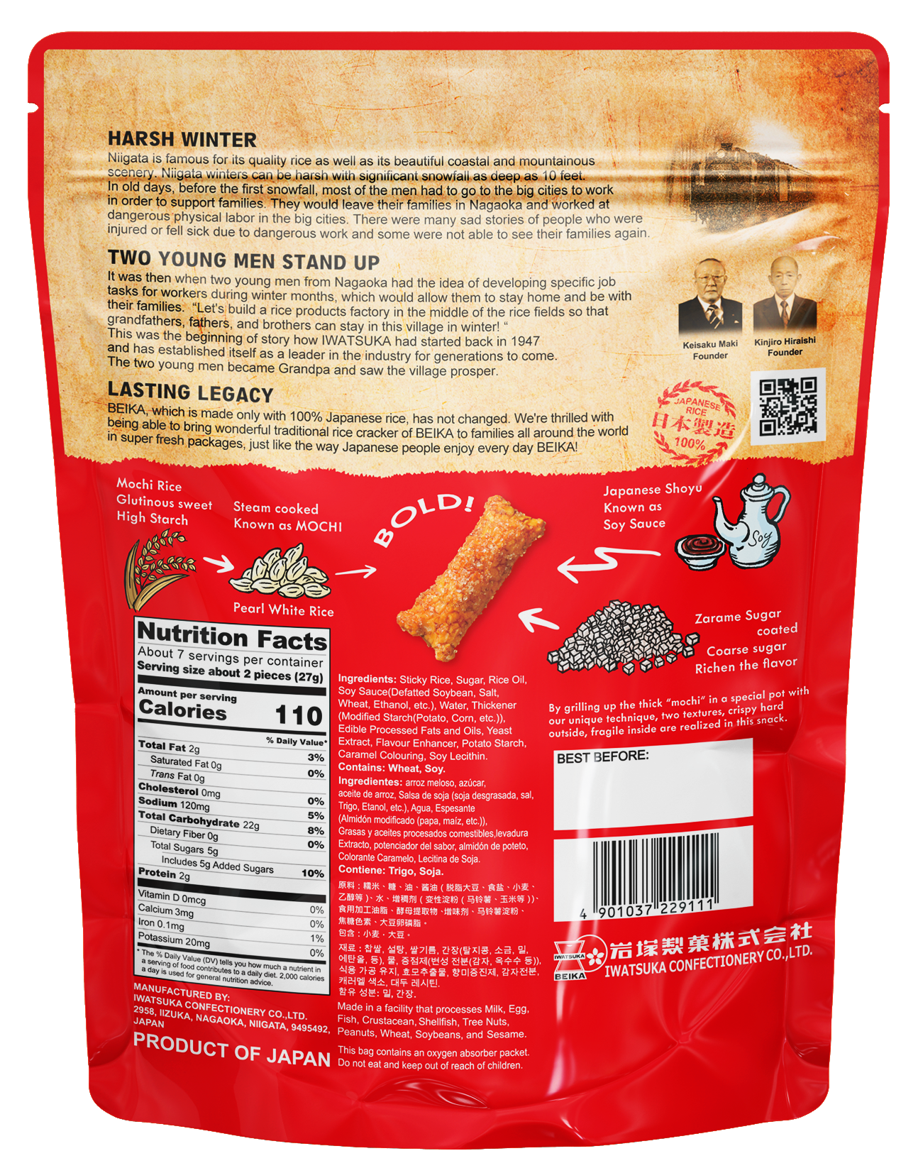 IWATSUKA's "Teriyaki" BEIKA is a sensory odyssey, a snack that has captivated a nation renowned for its discerning tastes. It is here that the savory depth of Tamari soy sauce meets the unique sweetness of zarame sugar, in a confluence of flavors that define the essence of teriyaki. Each cracker, crafted for those with an appreciation for the intricate dance of sweet and savory, embodies the boldness of innovation and the soul of traditional Japanese cuisine. The snack is an architectural marvel in taste and texture, featuring a delightfully crispy exterior that conceals a tender, almost fragile interior-a contrast that is as provocative as it is pleasing.